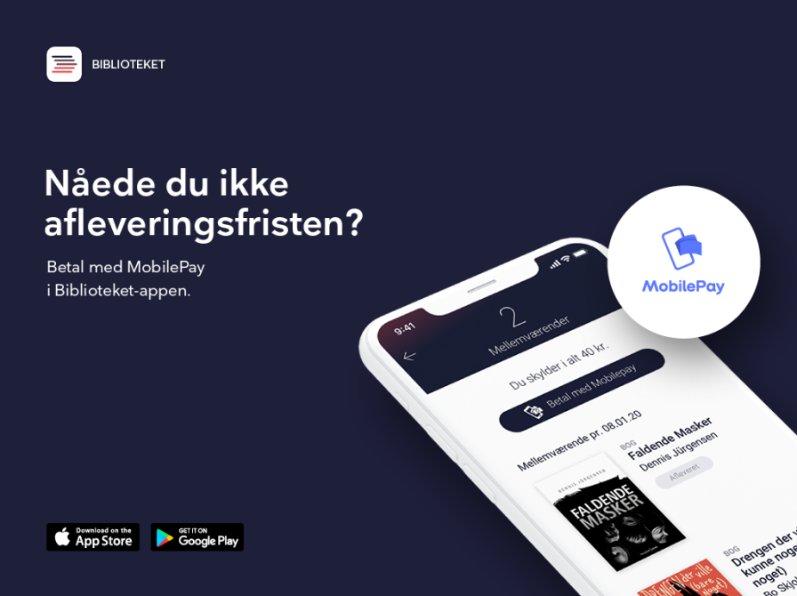 Du kan betale dine gebyrer ved henvendelse til personalet på biblioteket, men du kan også betale med MobilePay i app´en Biblioteket.