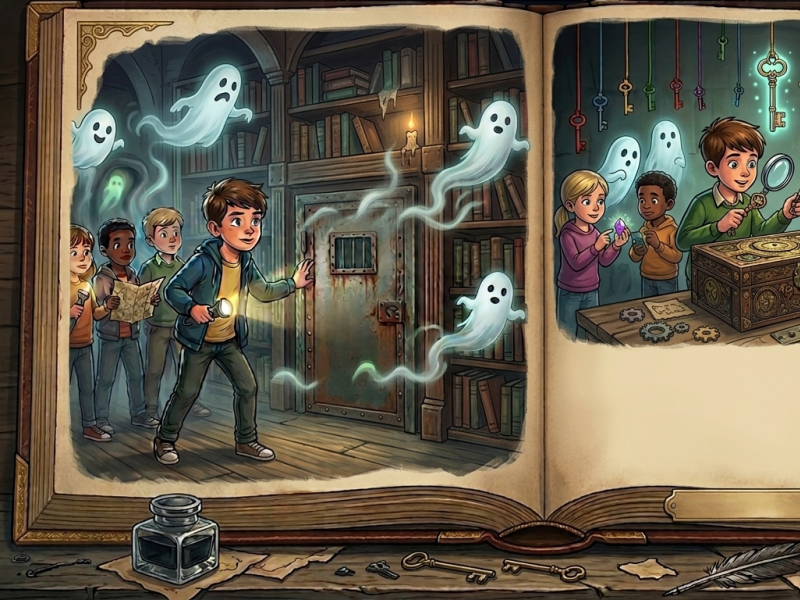 Haderslev BibliotekerneI dette mini Escape Room skal I arbejde sammen om at løse gåder, finde nøgler og opdage skjulte spor. Måske kan I hjælpe med at finde ud af, hvad der er sket – og få styr på spøgelserne.